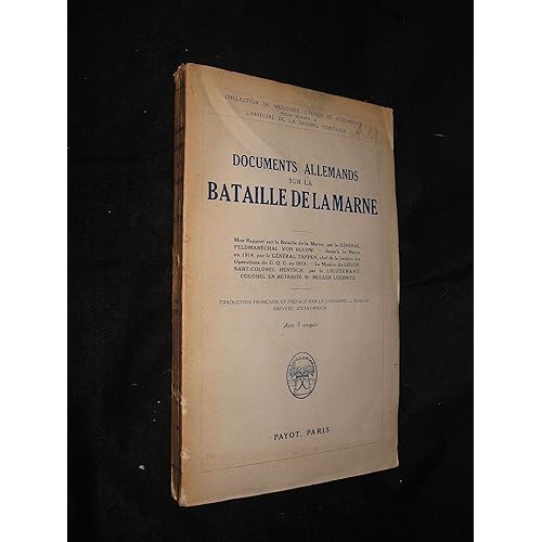 Descriptions Documents allemands sur la bataille de la Marne Mon rapport sur la bataille de la Marne par le gnral feldmarchal von Bulow Jusqu la Marne en 1914 par le gnral Tappen La Mission du lieutenantcolonel Hentsch par le lieutenantcolonel en retraite W MllerLoebnitz Traduction franaise et prface par L Koeltz Francais: