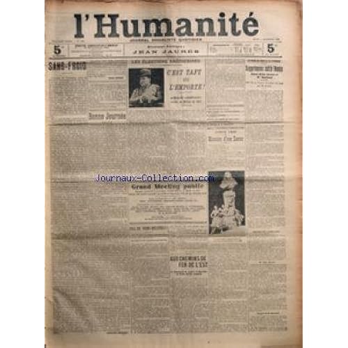 Descriptions HUMANITE L No 1652 du 06111908 SANG FROID PAR JEAN JAURES BONNE JOURNEE PAR GUSTAVE ROUANET LES ELECTIONS AMERICAINES CEST TAFT QUI LEMPORTE PAR JEAN LONGUET GRAND MEETING PUBLIC PAS DE DEMI MESURES CONFEDERATION GENERALE DU TRAVAIL AUX CHEMINS DE FER DE LEST CONTE VRAI HISTOIRE DUNE STATUE PAR VICTOR SNELL LA PEINE DE MORT A LA CHAMBRE SUPPRIMONS CETTE HONTE DISENT WILLM SEMBAT ET M DESCHANEL SEANCE DE LAPRES MIDI Francais: